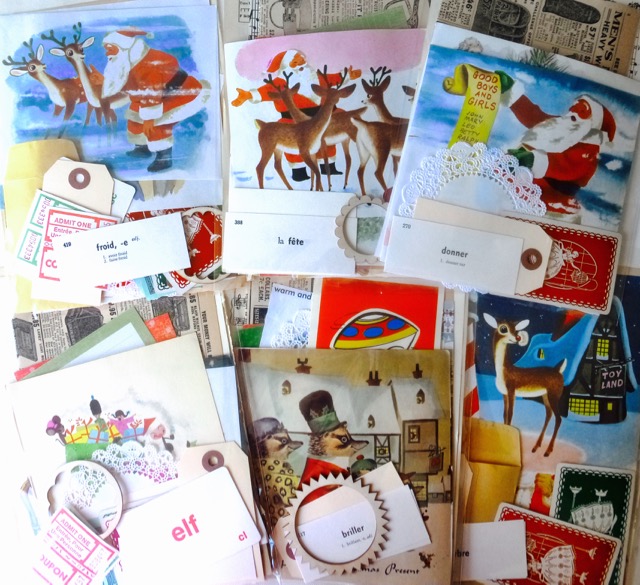 I’ve been tidying up the studio and put together some Christmas ephemera “scrap packs” full of vintage Christmas illustrations, music, green & red tickets, coupons, old music sheets, word flash cards (French & English) related to the holidays, plus lots more – there’s 50 pieces crammed in there!