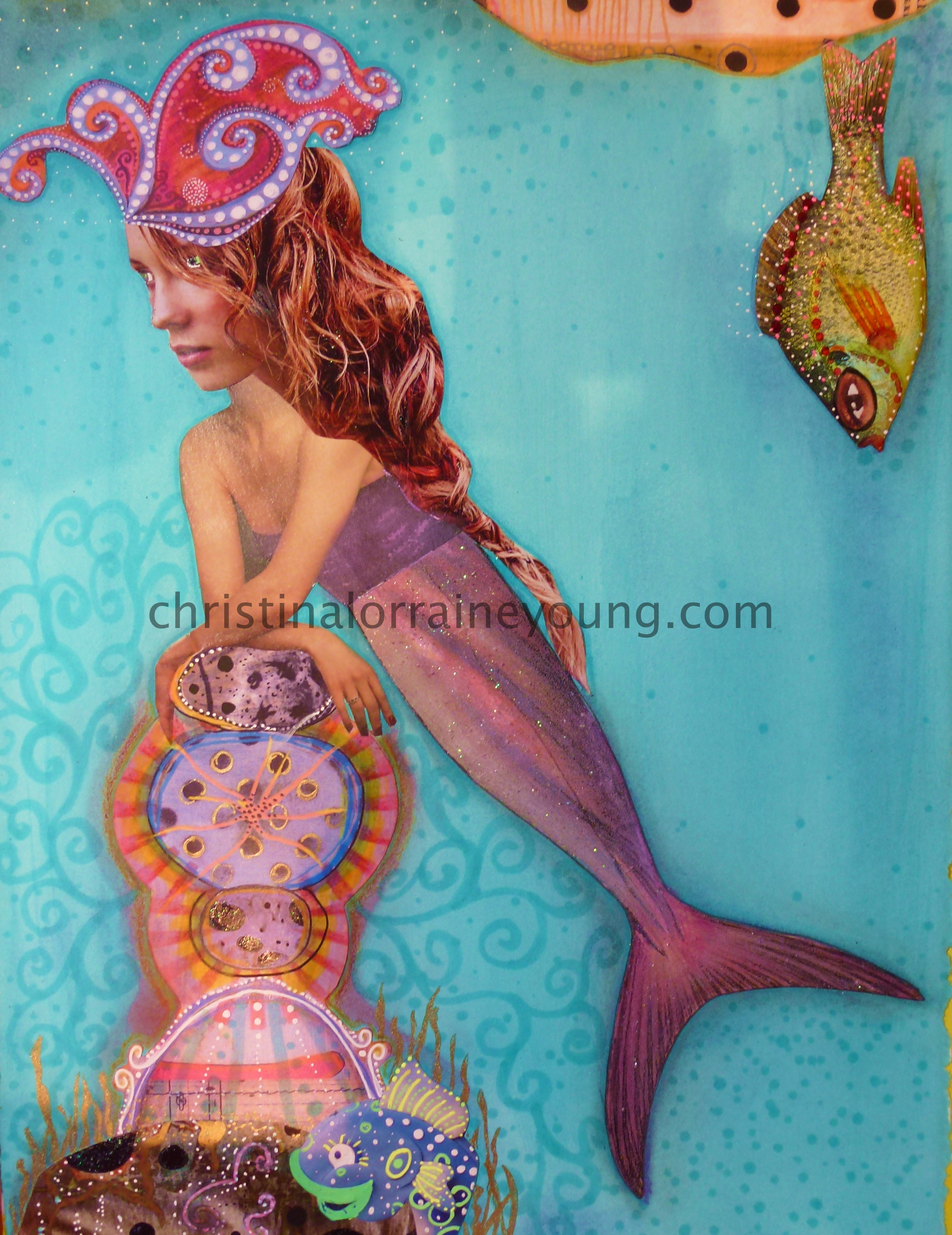 I’ve been lucky enough to participate in Jane Davenport’s and Teesha Moore‘s Mermaid Circus online workshop where we create, of course, mermaids! I want to share with you a couple of the many mermaids I’ve been working on. These pages aren’t quite finished as I find myself working on several pages at once, rather than completing a page before moving on to the next one.