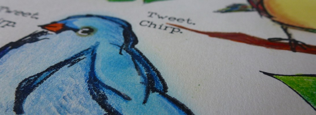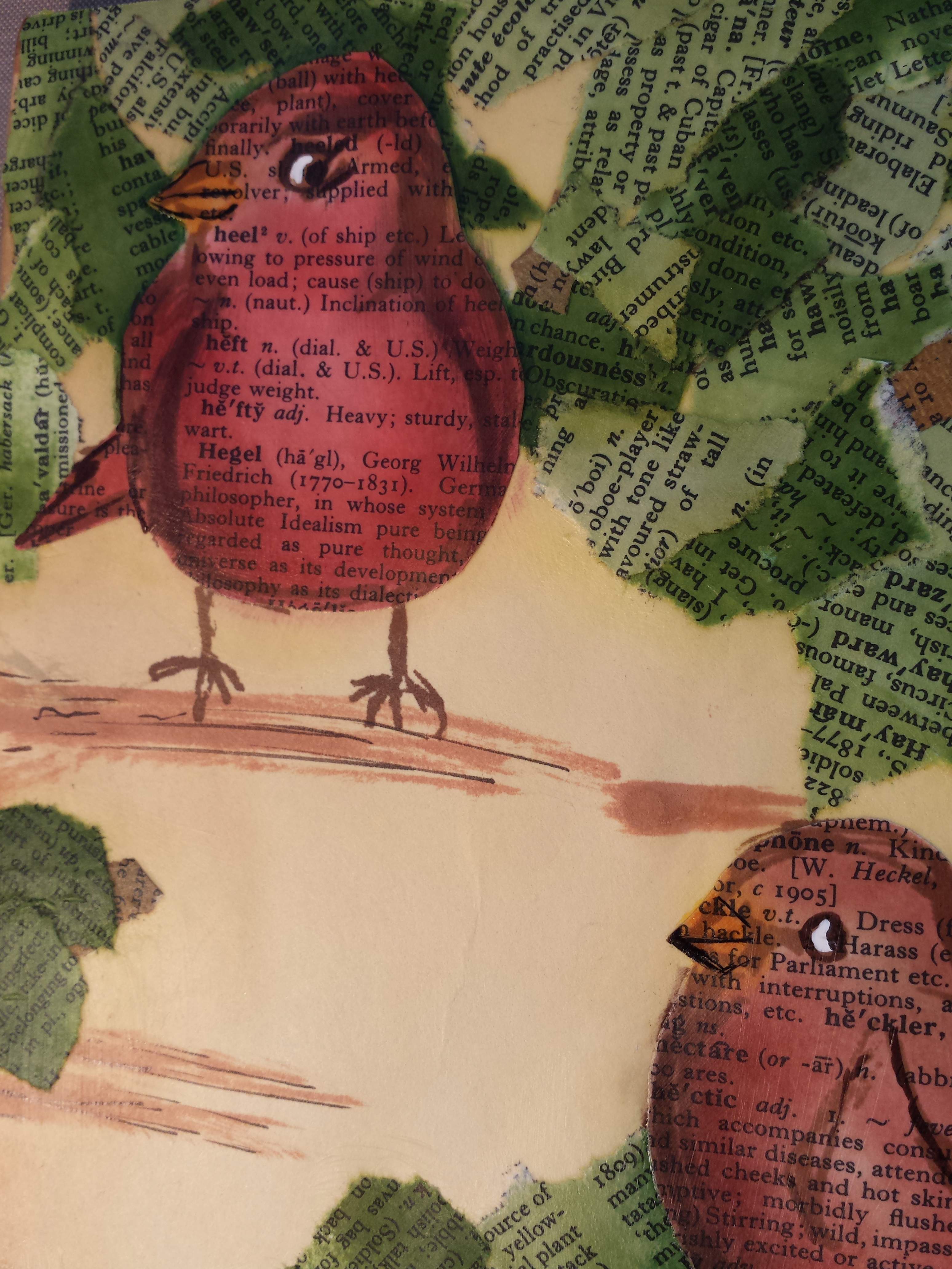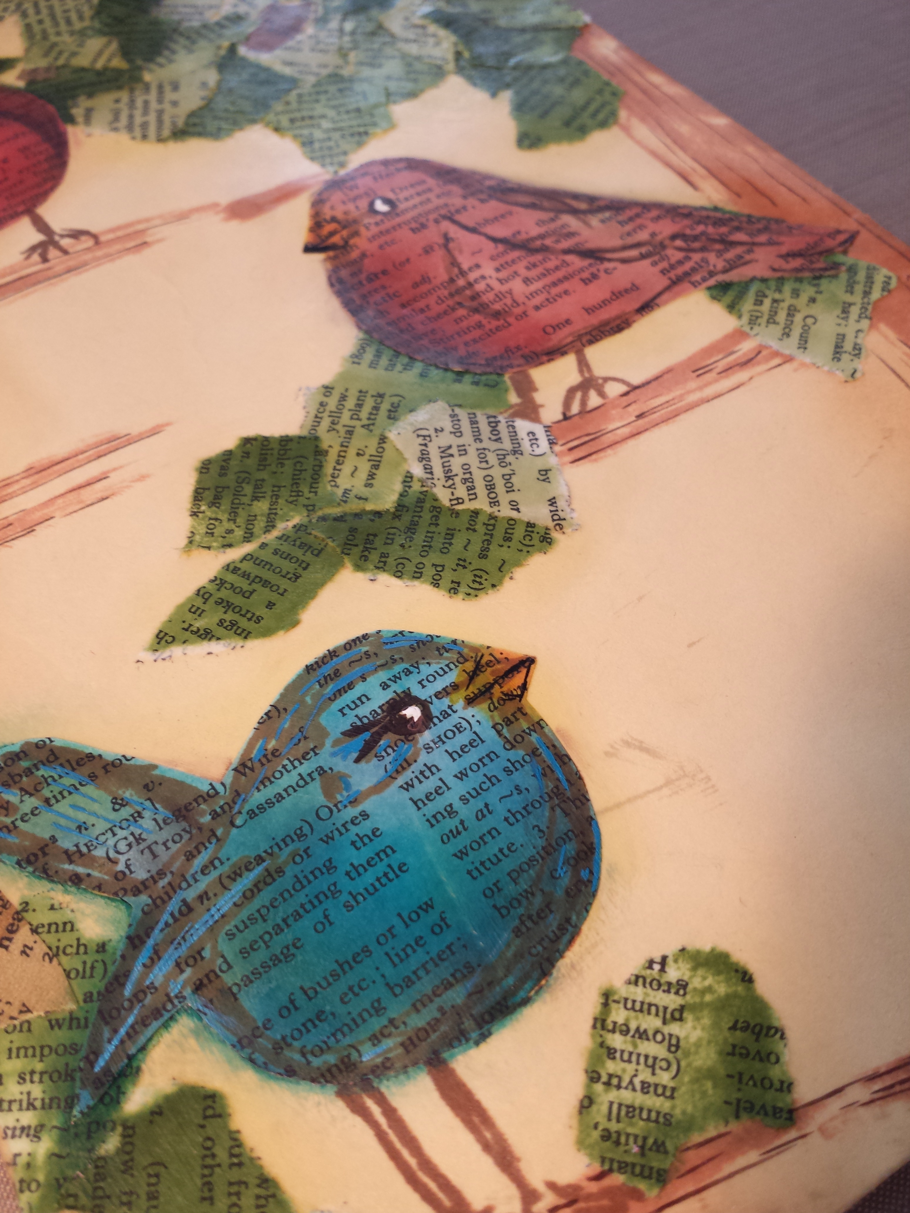 I restamped the bird images onto pages from an old dictionary and used distress inks to bring the birds to life. They aren’t ready to be glued down, though, because these birds need some shade and I want them in the foreground, not the background.