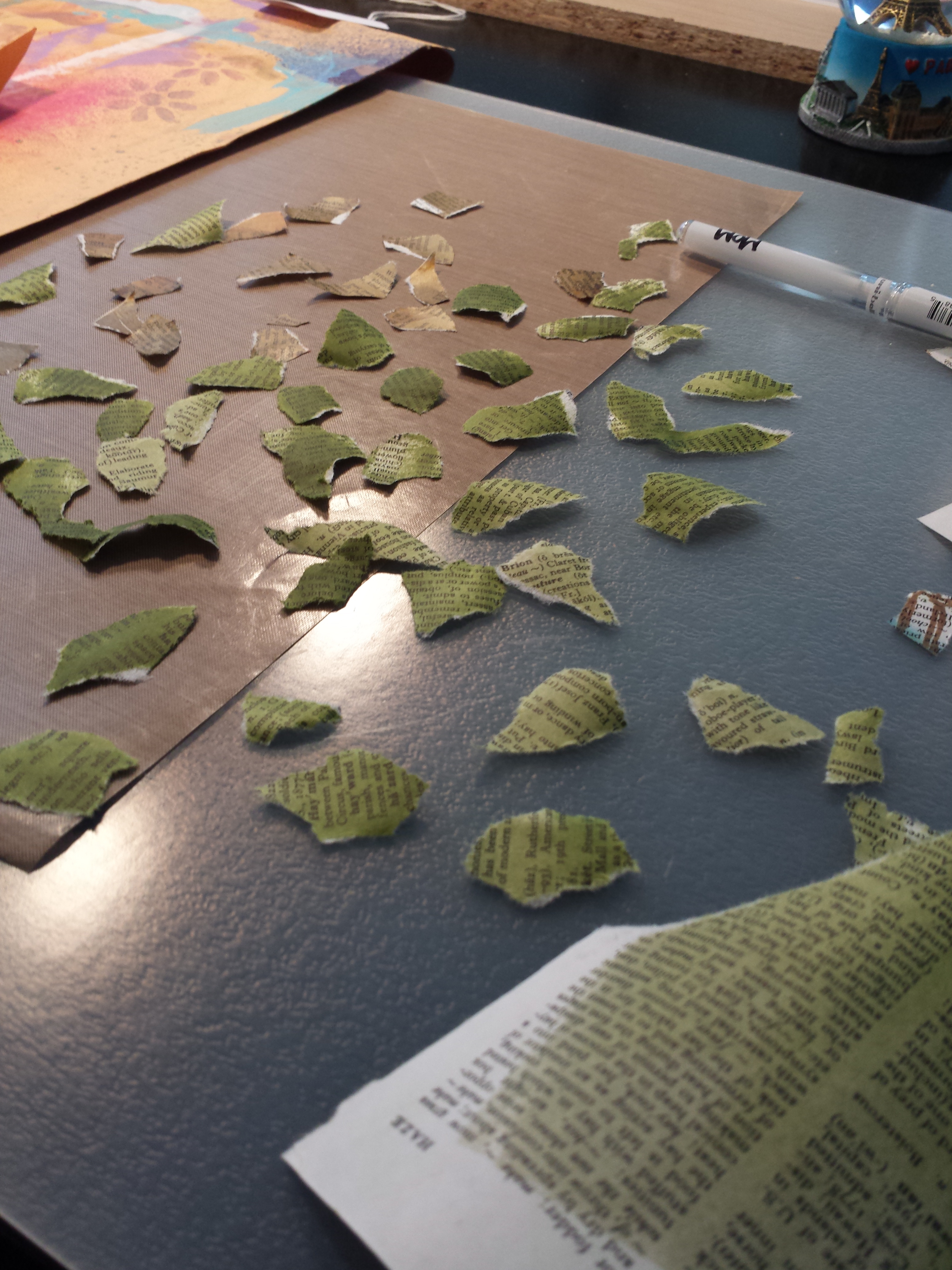 Here are my “leaves.” I used Distress Inks (once again!) in various greens to colour another dictionary page. Then I had fun ripping up the paper into leaf like shapes.