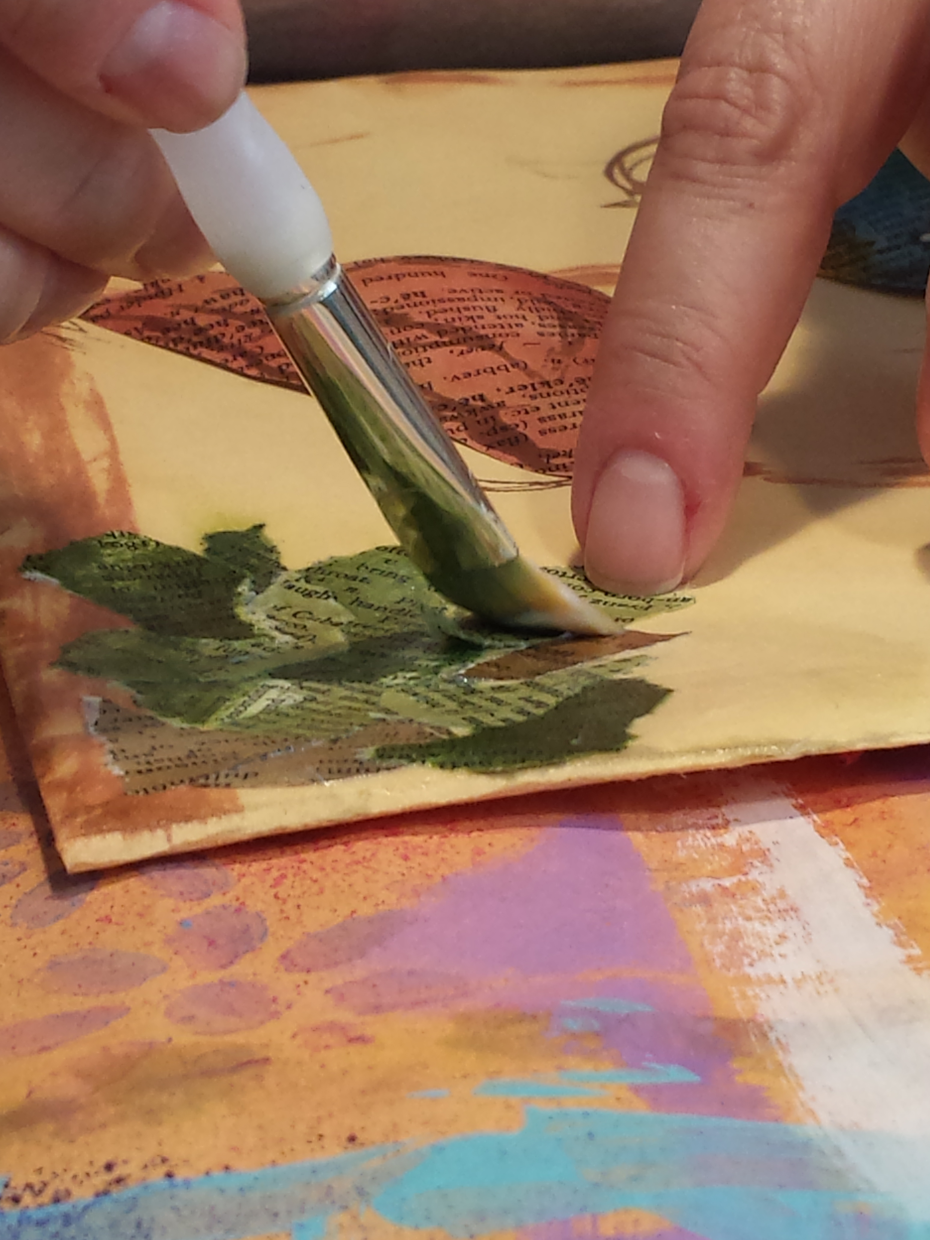 Golden’s fluid matte medium makes sure everything stays in place as I divvy up the shades of green for more visual interest.